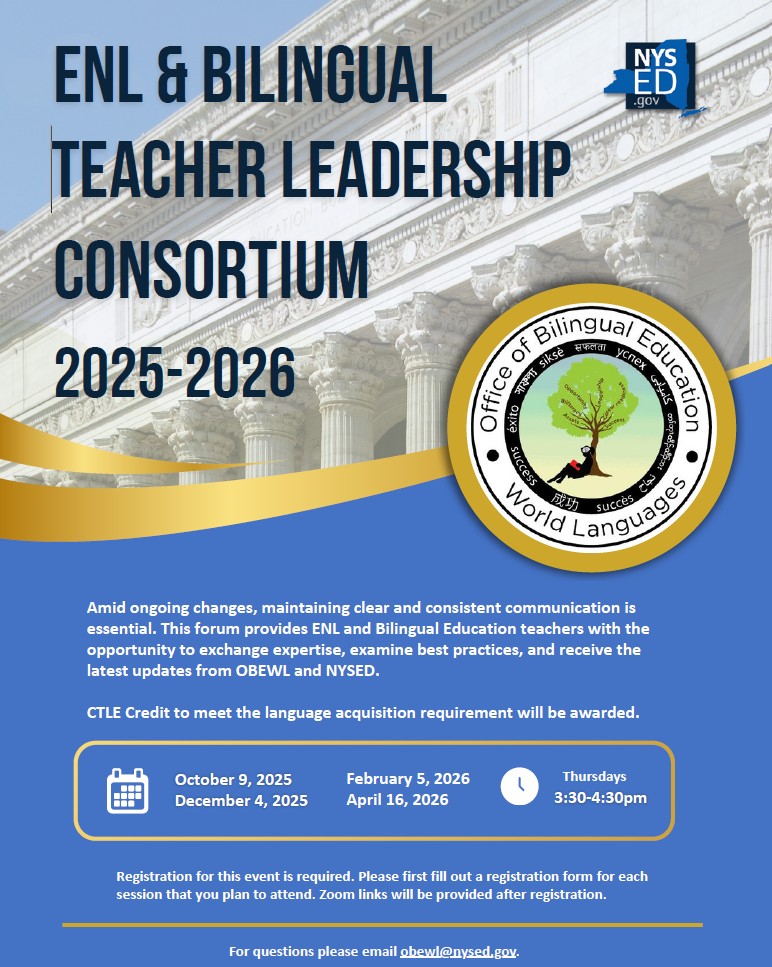 Amid ongoing changes, maintaining clear and consistent communication is essential. This forum provides ENL and Bilingual Education teachers with the opportunity to exchange expertise, examine best practices, and receive the latest updates from OBEWL and NYSED.